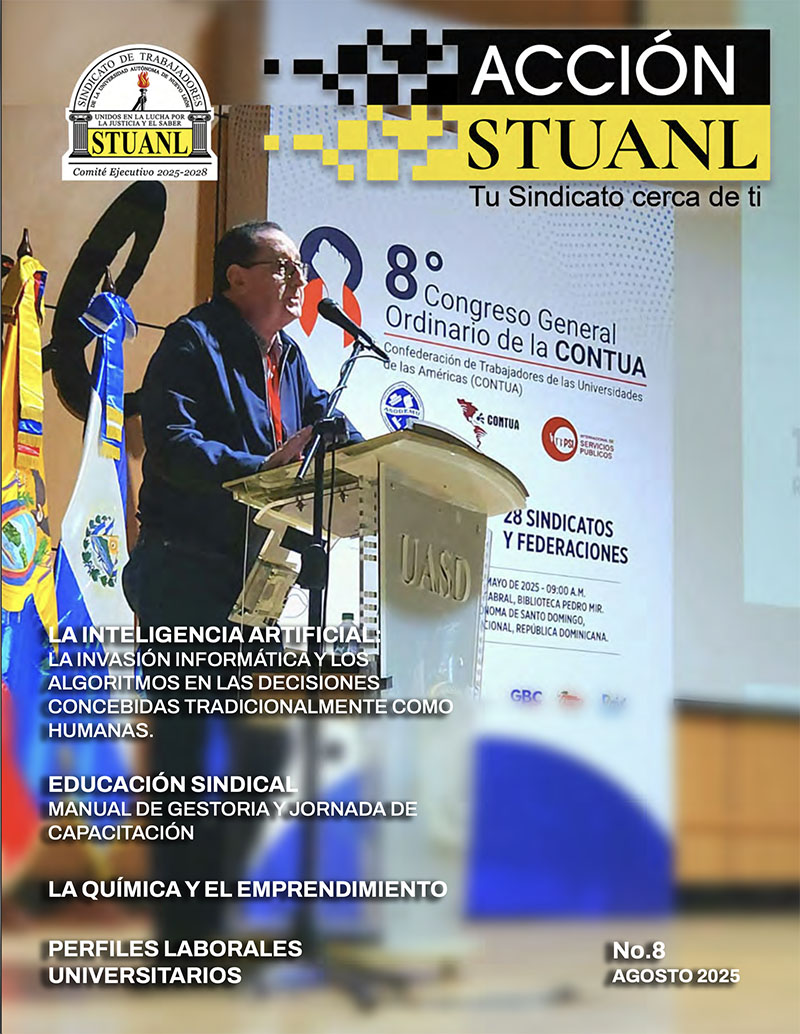 Un trabajador sindicalizado que inspira: la historia de Delfino Ojeda 3 octubre, 2025 Claudia Patricia Martínez Lozano: inclusión, resiliencia y sueños colectivos 1 octubre, 2025 Angélica Bretón Morán: música, inclusión y derechos laborales 10 septiembre, 2025 Una trayectoria con propósito: la historia de Yadira Quiñones Gutiérrez 8 septiembre, 2025 La inteligencia artificial: la invasión informática y los algoritmos en las decisiones concebidas tradicionalmente como humanas 29 agosto, 2025 La música como herramienta transformadora del ser humano 29 agosto, 2025 Sindicalismo universitario: dignidad, resistencia y futuro colectivo 29 agosto, 2025 Compromiso social y bienestar: el respaldo del STUANL a las familias trabajadoras 27 agosto, 2025 Entablar un nuevo discurso sindical: vigencia, compromiso y futuro 26 agosto, 2025 Una vida de servicio y compromiso sindical: la historia de Myriam Solano González 26 agosto, 2025 1 2 Descarga la Revista Acción Agosto 2025 Marzo 2025 Febrero 2025 Julio 2024 Abril 2024 Febrero 2024 Noviembre 2023 Septiembre 2023 ¿Tienes alguna duda? ¡Llámanos! (81) 1972-0100 (81) 1972-0101